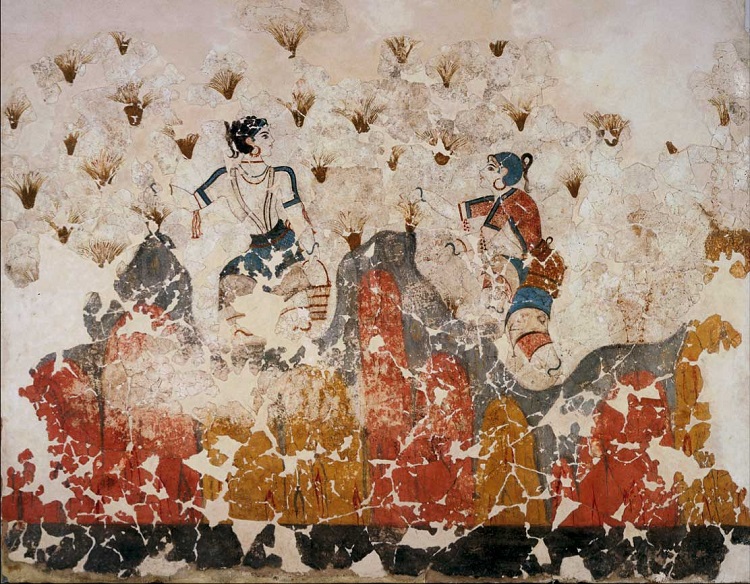 دانشمندان در این تحقیق خود میگویند: «آثار هنری تمدن مینوی احتمالاً قدیمیترین آثاری هستند که زعفران اهلی شده را به تصویر میکشند. برای مثال، تکههای انبوه گلهای کروکوس روی نقاشی دیواری «جمعآوران زعفران» از جزیره سانتورینی (تقریباً ۱۶۰۰ سال قبل از میلاد) حکایت از کشت این گیاه دارد. یکی دیگر از نقاشیهای دیواری در همان جزیره، «آدورانتها»، گلهایی را با کلالههای بلند و قرمز تیره نشان میدهد که نمونهای از زعفران اهلی شده است.» گلهایی با این ویژگیها نیز بر روی سرامیکها و پارچههای یونان عصر برنز به تصویر کشیده شدهاند و به صورت نمادین در ایدئوگرام زعفران با خط خط B باستانی ارائه شدهاند.