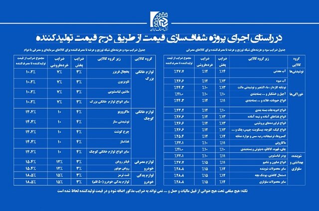 بنابر این گزارش، ضرایب منتشر شده در راستای اجرای پروژه شفافسازی قیمت از طریق درج قیمت تولیدکننده در مورد کالاهای مورد اشاره است که در نظام توزیع و برای ایجاد رقابت در بازار، تعدیل و واقعی کردن قیمتها و اصلاح نظام توزیع کالا اجرایی میشود و لازم است تا به منظور شفاف سازی مزایای اجرای این طرح برای مصرف کنندگان و تسهیل دوران گذار از روش قبلی به روش فعالی، به صورت مقطعی، علاوه بر درج قیمت تولیدکننده بر روی اقلام، هم زمان حداکثر قیمت مصرف کننده (با لحاظ ضرایب سود و هزینههای شبکه توزیع و عرضه بر اساس جدول پیوست شده) بر روی بسته بندی کالاها درج شود.