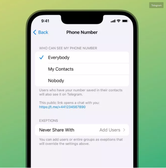 در بهروز رسانی لینک شماره تلفن شما میتوانید همیشه یک نام کاربری در تلگرام ایجاد و لینک t.me/username خود را به اشتراک بگذارید تا دیگران شما را بدون داشتن شماره تلفنتان پیدا کنند.در این به روز رسانی جدید نامهای کاربری باعث میشوند تا افراد امکان جستجوی جهانی شما را داشته باشند. همچنین این به روز رسانی به شما امکان میدهد پیوند مستقیم t.me را به شماره تلفن تلگرامی خود به اشتراک بگذارید.