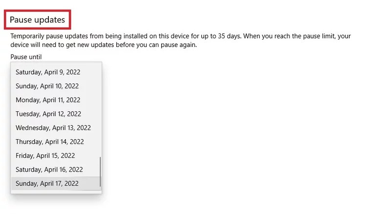 اگر لزوماً نیازی به غیرفعال کردن بهروزرسانیهای ویندوز ۱۰ برای همیشه ندارید و فقط میخواهید از آنها فاصله بگیرید، میتوانید آنها را تا ۳۵ روز متوقف کنید. در طول این مدت، ویندوز شما به طور خودکار خود را بهروزرسانی نمیکند. با این حال، این فقط یک مهلت کوتاه است. پس از اتمام دوره توقف، ویندوز قبل از اینکه بتوانید دوباره آن را در حالت تعلیق قرار دهید به یک بهروزرسانی کامل نیاز دارد.