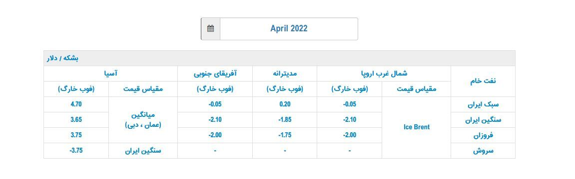 قیمت هر بشکه نفت خام سبک ایران برای فروش در ماه آوریل ۲ دلار و ۵ سنت، نفت خام سنگین ایران یک دلار و ۹۵ سنت و قیمت نفت خام فروزان ۲ دلار و ۵ سنت بیشتر از ماه مارس (اسفند – فروردین) است.