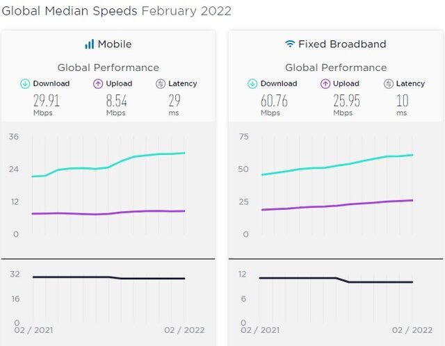 در حالی که تا ماه ژانویه سال ۲۰۲۲، میانه جهانی سرعت دانلود اینترنت موبایل، ۲۹.۶۲ مگابیت بر ثانیه و میانه جهانی سرعت آپلود اینترنت موبایل، ۸.۴۴ مگابیت بر ثانیه بود. در حوزه اینترنت ثابت نیز میانه جهانی سرعت دانلود، ۵۹.۸۴ مگابیت بر ثانیه و میانه جهانی سرعت آپلود ۲۵.۵۱مگابیت بر ثانیه بود.