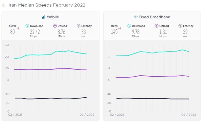 میانه سرعت دانلود اینترنت موبایل در ایران در ماه فوریه سال ۲۰۲۲، به ۲۲.۴۲ و میانه سرعت دانلود اینترنت ثابت ۹.۷۸ مگابیت بر ثانیه رسیده که ایران به ترتیب به رتبههای ۸۰ و ۱۴۵ جهانی رسانده است.