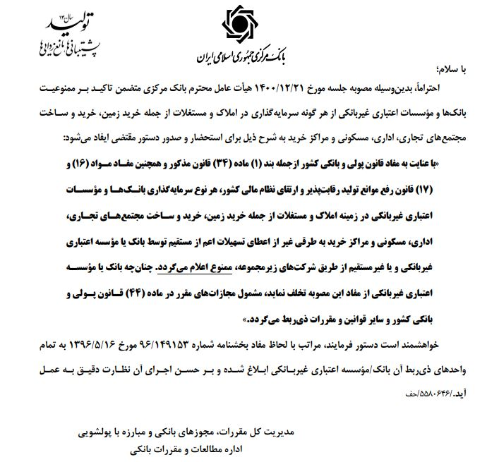 به گزارش سایت طلا به نقل از روابط عمومی بانک مرکزی، این بانک در بخشنامه ای به شبکه بانکی با اشاره به مفاد قانون پولی و بانکی کشور ازجمله بند (1) ماده (34) قانون مذکور و همچنین مفاد مواد (16) و (17) قانون رفع موانع تولید رقابتپذیر و ارتقای نظام مالی کشور، ابلاغ کرد: هر نوع سرمایهگذاری بانکها و مؤسسات اعتباری غیربانکی در زمینه املاک و مستغلات از جمله خرید زمین، خرید و ساخت مجتمعهای تجاری، اداری، مسکونی و مراکز خرید به طرقی غیر از اعطای تسهیلات اعم از مستقیم توسط بانک یا مؤسسه اعتباری غیربانکی و یا غیرمستقیم از طریق شرکتهای زیرمجموعه، ممنوع اعلام میشود.