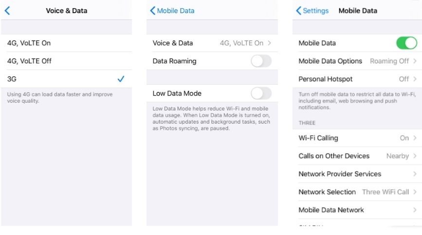به تنظیمات و سپس Cellular یا Mobile Data و Cellular Date Options یا Mobile Data Options بروید. گزینه Voice را انتخاب کنید. روی شبکه ۳G بجای LTE ضربه بزنید.