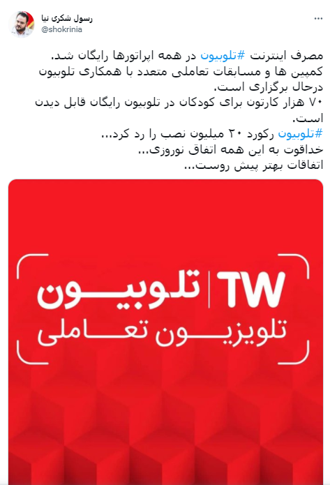در همین راستا، رسول شکری نیا، کارشناس ارشد رسانه و فضای مجازی از رایگان شدن مصرف اینترنت تلوبیون در همه اپراتورها خبر داده و نوشته است: