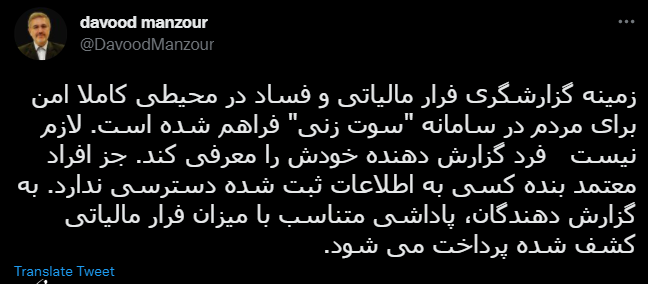 به گزارش سایت طلا،داوود منظور، رئیس سازمان امور مالیاتی در توئیتی نوشت: زمینه گزارشگری فرار مالیاتی و فساد در محیطی کاملا امن برای مردم در سامانه " سوت زنی " فراهم شده است. لازم نیست فرد گزارش دهنده خود را معرفی کند. جز افراد معتمد بنده کسی به اطلاعات ثبت شده دسترسی ندارد. به گزارش دهندگان، پاداشی متناسب با میزان فرار مالیاتی کشف شده پرداخت میشود.