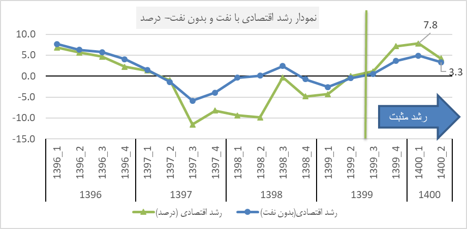 البته نتایج سیاستها و اقدامات یاد شده بر افزایش ظرفیت تولید زمانبر است و انتظار میرود نتایج آن در آمارهای فصول آینده به تدریج نمایان شود. در مجموع تولید ناخالص داخلی در شش ماهه ۱۴۰۰ از رشد مثبت برخودار بوده و مطابق با آمارهای مرکز آمار، معادل ۵.۹ درصد و مطابق با آمارهای بانک مرکزی برابر با ۳.۳ بوده است. در این دوره رشد ارزش افزوده استخراج نفت و گاز که در خط مقدم تحریمها بوده و آسیب زیادی در سالهای ۱۳۹۷ و ۱۳۹۸ دیده بود، از تابستان ۱۳۹۹ مثبت و در ادامه از زمستان ۱۳۹۹ دورقمی شده است.