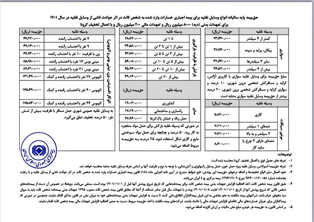 ۴- طبق قانون بیمه شخص ثالث، اخذ الحاقیه افزایش تعهدات بدنی بیمه شخص ثالث برای بیمهنامههایی که تاریخ شروع پوشش آنها قبل از ۱۴۰۱.۰۱.۰۱ بوده است، منتفی بوده و در خصوص آن دسته از بیمهنامههای شخص ثالثی که شروع پوشش آنها از تاریخ ۱۴۰۱.۰۱.۰۱ لغایت ۱۴۰۱.۰۱.۰۸ بوده و با تعهدات سال قبل صادر شدهاند، از آنجا که مطابق قانون بیمه شخص ثالث مصوب ۱۳۹۵، تعهدات بدنی بیمهنامه شخص ثالث در زمان صدور باید به میزان دیه ماههای حرام باشد، شرکتهای بیمه مکلفند به نحو مقتضی به این قبیل بیمهگذاران اطلاعرسانی کنند تا نسبت به افزایش تعهدات بدنی بیمهنامههای خود به میزان مقرر در قانون مذکور اقدام کنند.