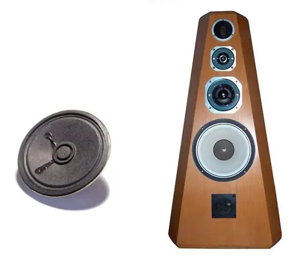 نمونهای از یک بلندگو یا باند چهارتایی گرانقیمت (سمت راست) در کنار یک بلندگوی ۳.۵ اینچی ارزان (سمت چپ)
