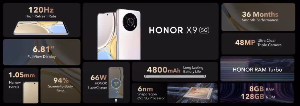 نمایشگر 6.81 اینچی IPS LCD این گوشی از نرخ رفرش 120 هرتزی برخوردار است. آنر از تراشه اسنپدراگون 695 در X9 استفاده کرده که از اینترنت 5G نیز پشتیبانی میکند. اندروید 11 و رابطکاربری MagicUI 4.2 نیز روی این دستگاه به صورت پیشفرض اجرا میشود. خوشبختانه هیچ محدودیتی در پشتیبانی از خدمات گوگل در این گوشی وجود ندارد.