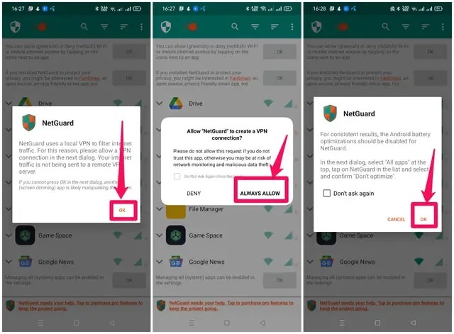 اگر میخواهید دسترسی یک برنامه اندروید به اینترنت را قطع کنید، اپلیکیشنهای سوم شخص زیادی در گوگل پلی استور وجود دارند که میتوانند این کار را برایتان انجام دهند، در صورت تمایل میتوانید از اپهای NetGuard در این زمینه استفاده کنید. بعد از نصب اپ مورد نظر، باید دستورالعملهای لازم را برای قطع دسترسی اپلیکیشنها به اینترنت رار دنبال کنید.