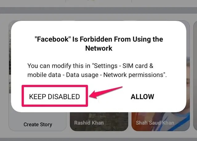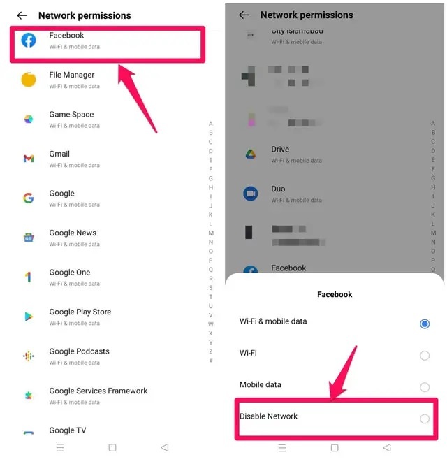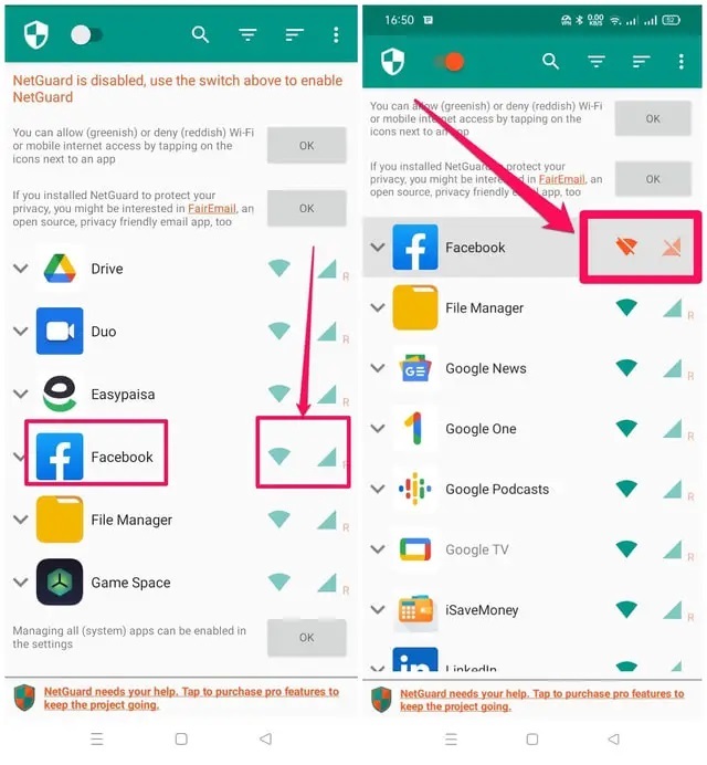 قدم پنجم: برای اینکه دسترسی یک برنامه اندروید به اینترنت وای-فای و یا ۴G را قطع کنید باید روی آیکون کناری آن در سمت راست رفته و اگر تمایل دارید که دسترسی به وای-فای و ۴G به صورت همزمان قطع شود روی هر دو آیکون کلیک کنید. در تصویر زیر ما دسترسی اپ فیسبوک را قطع کردیم.