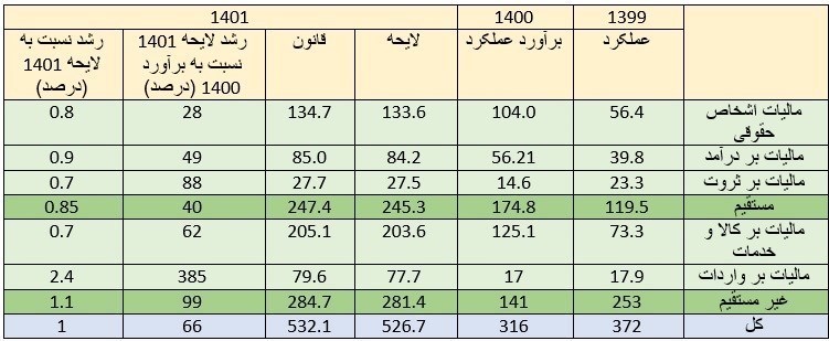 بر این اساس مالیات اشخاص حقوقی از 104 هزار میلیارد تومان برآورد عملکرد در سال 1400 به 134.7 هزار میلیارد تومان در قانون بودجه سال 1401 افزایش یافته که رشد حدود 29 درصدی را نشان می‌دهد. همچنین مالیات بر درآمد نیز از 56.21 هزار میلیارد تومان برآورد عملکرد در سال 1400 به 85 هزار میلیارد تومان در قانون بودجه سال 1401 افزایش یافته که رشد حدود 50 درصدی داشته است.