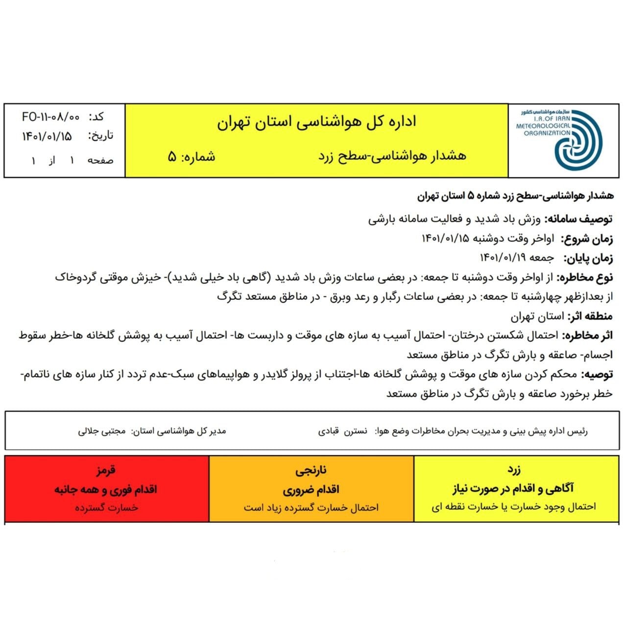 مدیر کل هواشناسی استان تهران از صدور هشدار زرد در استان خبر داد و گفت: وزش شدید باد و فعالیت سامانه بارشی از اواخر امروز دوشنبه ۱۵ فروردین تا جمعه ۱۹ فروردین ماه پیش بینی شده است.