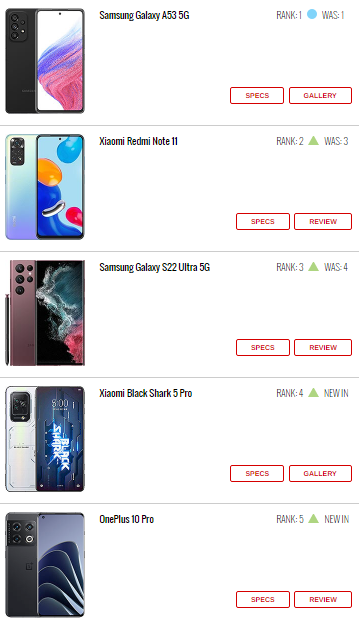 گوشی جدید BlackShark ۵ Pro که به تازگی معرفی شده به جایگاه چهارم رسیده، در حالی که OnePlus ۱۰ Pro رتبه پنجم را کسب کرده است.