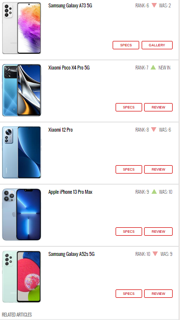 گوشی A۷۳، ۵G سامسونگ در مقایسه با هفته گذشته پنج پله سقوط کرده و به جایگاه ششم رسیده است. موبایل پوکو X4 با به روزرسانیهای جدید خود توانسته به جدول برترین گوشیهای جهانی وارد شود و جایگاه هفتم را از آن خود کند. در حالی که Xiaomi ۱۲ Pro این شرکت که امسال به بازارهای جهانی عرضه شده، به رتبه ۸ سقوط کرده است. دو جایگاه آخر مانند هفته گذشته به آیفون ۱۳ پرو مکس و گلکسی A۵۲s میرسد.
