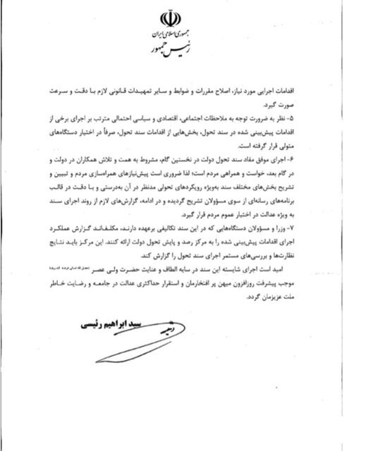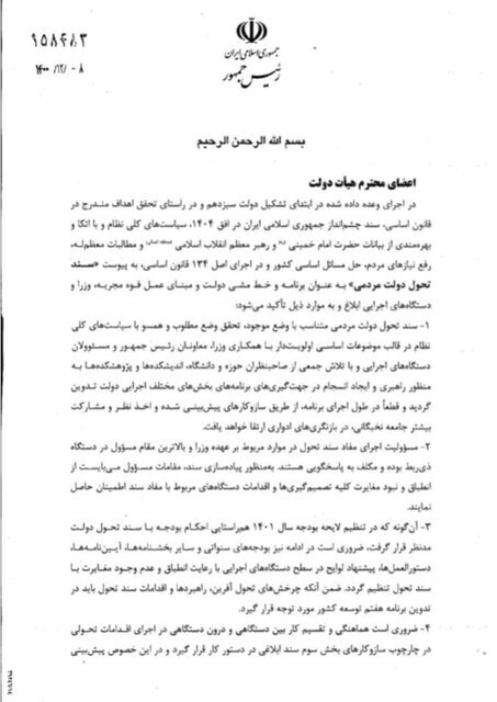 «سند تحول دولت مردمی» از سوی حجتالاسلام و المسلمین ابراهیم رئیسی رییس جمهوری ایران در ۸ اسفندماه سال جاری به اعضای هیات دولت ابلاغ شد. در این سند آمده است: "در اجرای وعده داده شده در ابتدای تشکیل دولت سیزدهم و در راستای تحقق اهداف مندرج در قانون اساسی، سند چشم انداز جمهوری اسلامی ایران در افق ۱۴۰۴، سیاست های کلی نظام و با اتکا و بهره مندی از بیانات امام خمینی (ره) و مقام معظم رهبری، رفع نیازهای مردم، حل مسائل اساسی کشور و در اجرای اصل ۱۳۴ قانون اساسی «سند تحول دولت مردمی» به عنوان برنامه و خط مشی دولت و مبنای عمل قوه مجریه، وزا و دستگاه های اجرایی ابلاغ می شود.»