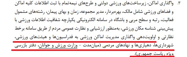 در بخش تصدیگری دولت در ورزش به عنوان عامل در ضعف نظام ورزشی حرفهای و ملی، مردمیسازی نظام مدیریت ورزش به عنوان اولین راهبرد تعریف شده و ۶ اقدام مهم در این راستا باید انجام شود که یکی از آنها؛ واگذاری اماکن، زیرساختهای ورزشی دولتی و طرحهای نیمه تمام با ثبت اطلاعات کلیه اماکن و فضاهای ورزشی شامل مالک، بهره بردار، مدیر مجموعه، زمان و بهای پیمان، رشتههای مشمول فعالیت، رتبه و سطح مربی و باشگاه در سامانه الکترونیکی یکپارچه شفافیت اطلاعات ورزشی با پیشبینی شناسه مکان ورزشی، به منظور ارزشیابی و نظارت عمومی مردم از طریق سامانه برخط نظارتی و اولویتدهی واگذاری مدیریت اماکن ورزشی به فدراسیونها و هیاتهای ورزشی، شهرداریها، دهیاریها و نهادهای مردمی (میان مدت – وزارت ورزش و جوانان، دفتر بازرسی ویژه ریاست جمهوری) است.