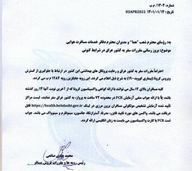 به گزارش سایت طلا ، به تازگی دستورالعمل جدید سفر به عراق به شرکتهای گردشگری و هواپیمایی ایران ابلاغ شده است که بر این اساس، مسافران ورودی به این کشور به ارائه گواهی معتبر واکسیناسیون کووید و یا آزمایش منفی PCR ملزم شدهاند. همچنین اعلام شده که عراق واکسنهای فایزر/ مدرنا/ آسترازنکا/ جانسون/ سینوفارم/ سینوواک را برای سفر به این کشور مورد تایید قرار داده است. با این حال، حجتالاسلام والمسلمین صحبتالله رحمانی ـ معاون امور عتبات عالیات سازمان حج و زیارت ـ با "شایعه" خواندن این دستورالعمل، گفت که داشتن کارت واکسیناسیون مورد تایید وزارت بهداشت و جواب منفی آزمایش PCR از قبل وجود داشته است.