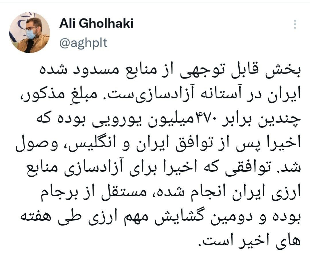 علی قلهکی، فعال رسانهای اصولگرا نوشت: بخش قابل توجهی از منابع مسدود شده ایران در آستانه آزادسازیست.