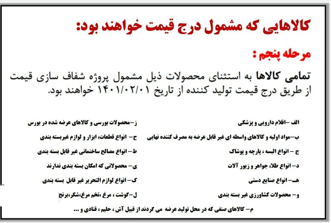 براین اساس تمامی کالاها به استثنای محصولات ذیل مشمول پروژه شفاف سازی قیمت از طریق درج قیمت تولید کننده از تاریخ 1401.2.1 خواهند بود.