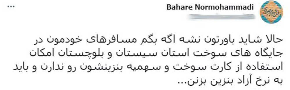 برخی کاربران فضای مجازی هم به موضوع عدم امکان سوختگیری یارانهای غیربومیان در استان سیستان و بلوچستان اشاره کردهاند؛ موضوعی که طبق اعلام ستاد مرکزی مبارزه با قاچاق کالا و ارز، برای جلوگیری از قاچاق سوخت صورت گرفته است.