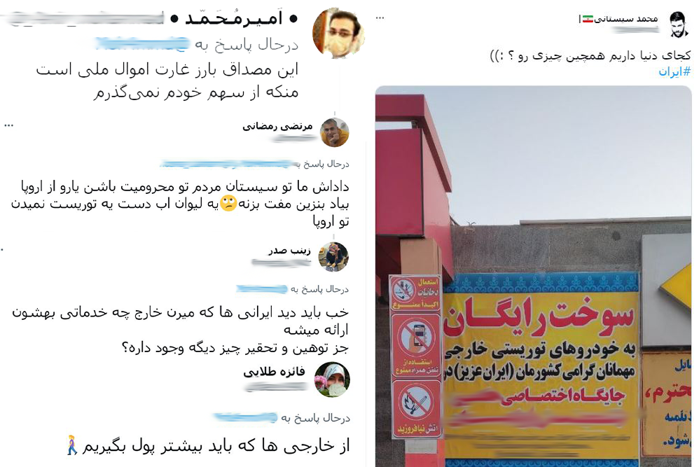 مخالفان توزیع سوخت رایگان برای گردشگران خارجی، این را مصداق غارت اموال ملی دانسته و نوشتهاند، در شرایطی که مردم سیستان و بلوچستان در محرومیت به سر میبرند، نباید به گردشگران خارجی، بنزین رایگان تحویل داد.