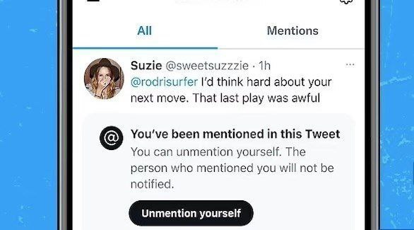 مفهوم دکمه Unmention برای اولین بار در جولای سال گذشته فاش شد و این ویژگی در حال حاضر هنوز برای کاربران توئیتر آزمایشی است. برای استفاده از این ویژگی جدید، هنگامی که به طور گستردهتر عرضه شد، کافی است «لغو نشان خود از این مکالمه» را از منوی «اطلاعات بیشتر» انتخاب کنید و در نتیجه آن پیوند نمایه شما حذف خواهد شد.
