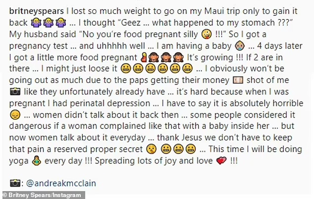 بریتنی اضافه کرد:«سخت است زیرا زمانی که باردار بودم افسردگی پری ناتال داشتم… باید بگویم که کاملاً وحشتناک است… زنان در آن زمان در مورد آن صحبت نمی کردند … برخی از مردم آن را خطرناک می دانستند که زنی با یک کودک در شکمش اینجور شکایت کند…. اما اکنون زنان هر روز در مورد آن صحبت می کنند … ممنون عیسی، ما مجبور نیستیم آن درد را به عنوان یک راز محفوظ نگه داریم … این بار من هر روز یوگا انجام خواهم داد !!! شادی و عشق زیادی را پخش خواهم کرد !!!»