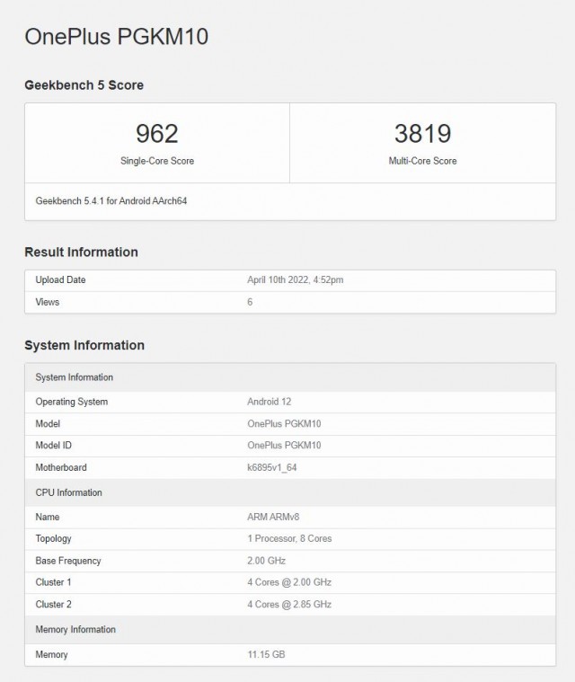 این هندست در تستهای پردازش تک هستهای و چندهستهای گیکبنچ بهترتیب امتیازات 962 و 3819 را کسب کرده است. با اینحال اطلاعات اخیرا کسب شده نشان میدهند که توان پردازشی وانپلاس Ace از طریق تراشه Dimensity 8100 بههمراه 12 گیگابایت تامین خواهد شد. بعلاوه این گجت با سیستمعامل اندروید 12 در دسترس خریداران قرار خواهد گرفت.