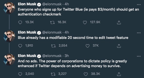 ماسک نوشت: «هرکسی که در Twitter Blue ثبتنام میکند (یعنی ۳ دلار در ماه میپردازد) باید یک علامت تأیید هویت دریافت کند؛ و استفاده اش از توئیتر بدون تبلیغات باشد. اگر توییتر برای بقای خود به پول تبلیغات وابسته باشد، قدرت شرکتها در دیکته کردن سیاستها به شدت افزایش مییابد.»