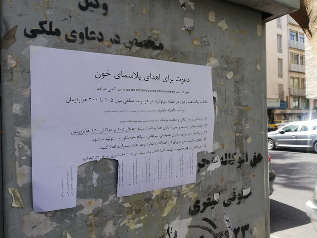 «هم کار خیر، هم کمی درآمد. فقط با یک ساعت زمان در هفته می‌توانید در هر نوبت مبلغی بین ۱۰۵ تا ۲۰۰ هزار تومان درآمد داشته باشید.» این پیام، دعوتی برای اهدای پلاسمای خون است که این روزها روی دیوارهای بعضی از خیابان‌های شهر چسبانده‌اند.