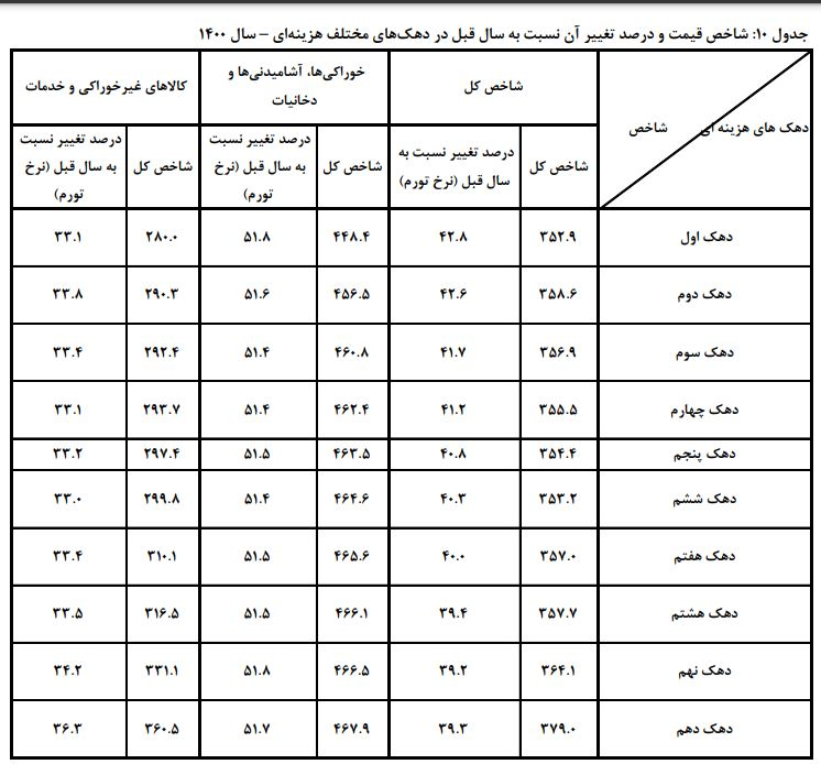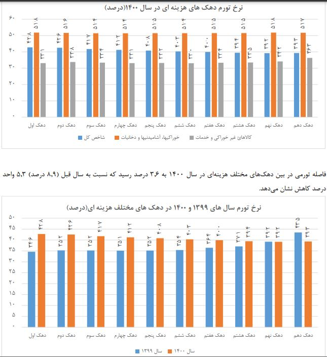 نرخ تورم کل کشور در سال ١٤٠٠ برابر ٤٠.٢ درصد است که در دهک‌های مختلف هزینه‌ای در بازه ٤٢.٨ درصد برای دهک اول تا ٣٩.٢ درصد برای دهک نهم نوسان دارد. محدوده تغییرات تورم دوازده ماهه در گروه عمده «خوراکی‌ها، آشامیدنی‌ها و دخانیات» بین ٥١.٨ درصد برای دهک‌های اول و نهم تا ٥١.٤ درصد برای دهک‌های سوم، چهارم و ششم است. هم چنین اطلاع مذکور در مورد گروه عمده «کالاهای غیر خوراکی و خدمات» بین ٣٣.٠ درصد برای دهک ششم تا ٣٦.٣ درصد برای دهک دهم است.