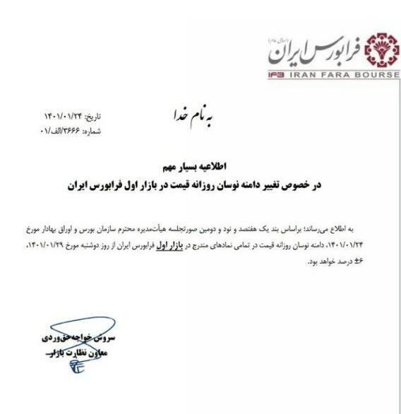 طبق اعلام فرابورس ایران، از ۲۹ فروردین دامنه نوسان بازارهای اول بورس تهران و فرابورس ایران ۶ درصد خواهد بود.