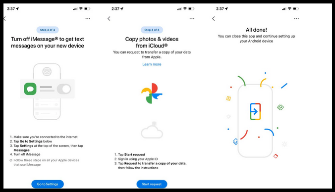 گوگل از شما میخواهد، iMessage را در منوی تنظیمات خود غیرفعال کنید تا مطمئن باشید که ارتباط با دوستان خود را از دست نمیدهید. در نهایت، برای شما گزینهای نمایش داده میشود که با استفاده از صادرکننده داده اپل، عکسها و ویدیوهای خود را از iCloud در Google Photos کپی کنید. پس از انجام این مراحل، برنامه Switch to Android از شما میخواهد که راه اندازی را در Android ادامه دهید.