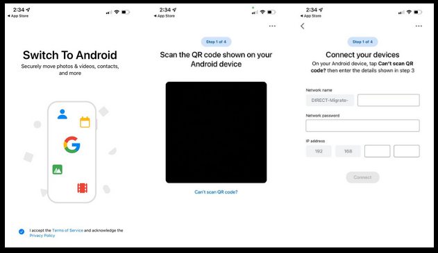 همچنین اپل، قبل از گوگل برنامه مشابهی را با نام «Move to iOS» برای کاربران اندرویدی منتشر کرده بود تا بتوانند اطلاعات خود مانند مخاطبین، تصاویر، ویدیوها و پیامها را به آیفون منتقل کنند. این اپ هم مانند برنامه گوگل به صورت بیسیم کار میکند. پس از راهاندازی این برنامه و پذیرفتن شرایط و ضوابط آن، با یک رابط دوربین برای گرفتن کد QR روبرو میشوید. این کد در تلفن Android شما نمایان میشود. اگر چه میدانید کد QR، نوعی اتصال شبکه بین دو تلفن برای انتقال داده ایجاد میکند.