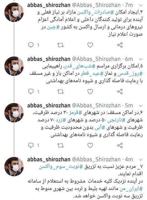 ۷. مردم عزیز نسبت به تزریق نوبت سوم واکسن اقدام نمایند. در آینده نزدیک کلیه خدمات مشروط به استعلام از سامانه ایران من مانند تهیه بلیط و تردد بین شهری منوط به تزریق سه نوبت واکسن خواهد شد.»