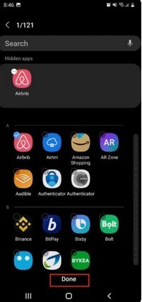 مرحله ۳: برنامه مورد نظر را که قصد مخفی کردن آن را دارید انتخاب کنید. شما همچنین میتوانید آن را جست و جو کنید. پس از انتخاب برنامههای مورد نظر روی Done (انجام شد) در قسمت سمت راست بالای صفحه ضربه بزنید. برنامه مورد نظر شما مخفی خواهد شد.