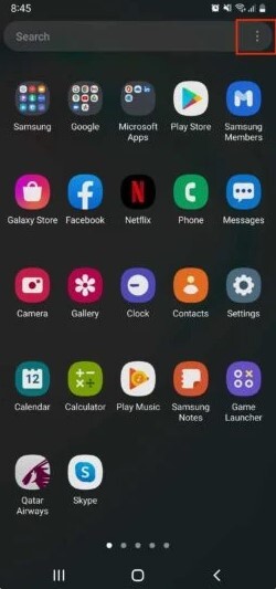 مرحله ۱: برای بازکردن لانچر، انگشت خود را در صفحه اصلی به سمت بالا بکشید یا در مدلهای قدیمیتر در صفحه نخست روی Apps (برنامه ها) ضربه بزنید. سپس روی نماد سه نقطه در گوشه سمت راست در بالا ضربه بزیند.