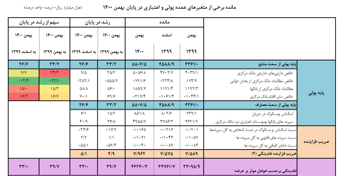 براساس دادههای آماری بانک مرکزی، حجم نقدینگی در بهمن ماه سال ۱۴۰۰ برابر چهار هزار و ۶۲۴ هزار میلیارد تومان شد که در مقایسه با بهمن ماه سال ۱۳۹۹، ۳۹.۷ درصد رشد داشته است. همچنین نقدینگی در بهمن ماه ۱۴۰۰ در مقایسه با اسفند سال قبل از آن ۳۳ درصد افزایش یافته است.