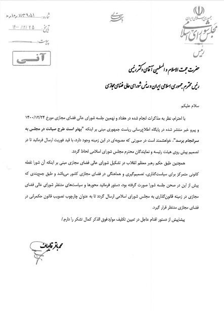 با احترام، نظر به مذاکرات انجام شده در هفتاد و نهمین جلسه شورای عالی فضای مجازی مورخ 1400.12.24 و پیرو خبر منتشر شده در پایگاه اطلاعرسانی ریاست جمهوری مبنی بر اینکه «بهتر است طرح صیانت در مجلس به سرانجام برسد»، خواهشمند است در صورتی که مصوبهای در این زمینه وجود دارد، با قید فوریت ارسال فرمایید تا در تصمیم پیش روی هیات رئیسه و نمایندگان محترم مجلس شورای اسلامی لحاظ گردد.