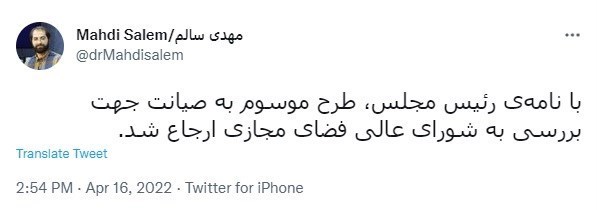 درحالی که مهدی سالم، مشاور وزیر ارتباطات و فناوری اطلاعات، در توییتر خود اعلام کرد که «با نامه رئیس مجلس شورای اسلامی، طرح موسوم به صیانت، جهت بررسی به شورای عالی فضای مجازی ارجاع شد.» که احساس میشود هنوز ابهاماتی در این زمینه باقی مانده است.