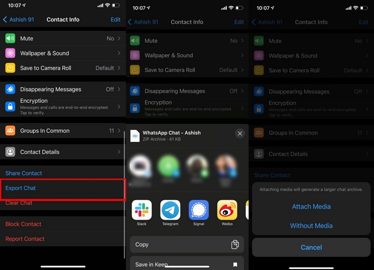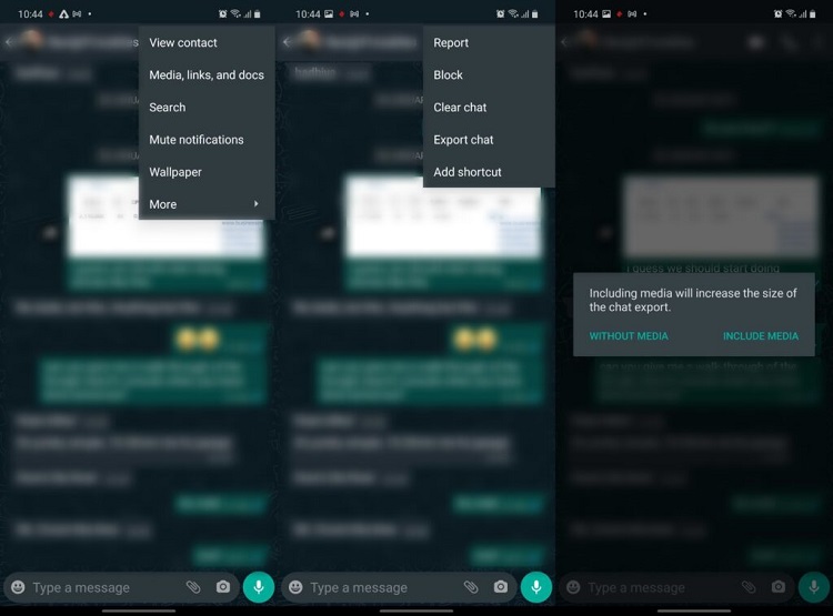 ۳- روی گزینه Export chat ضربه بزنید؛ پس از آن پیامی از شما می‌پرسد که آیا می‌خواهید گفتگو را با یا بدون مدیا (تصاویر و ویدئو) منتقل کنید.