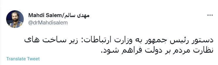 به گزارش سایت طلا،ساعاتی پیش «مهدی سالم»، مشاور وزیر ارتباطات و فناوری اطلاعات، در توییتی در صفحه توییتر خود از دستور ریاست جمهوری به وزارت ارتباطات خبر داد و نوشت که دستور ریاست جمهوری به وزارت ارتباطات این است که زیرساختهای نظارت مردم بر دولت فراهم شود.