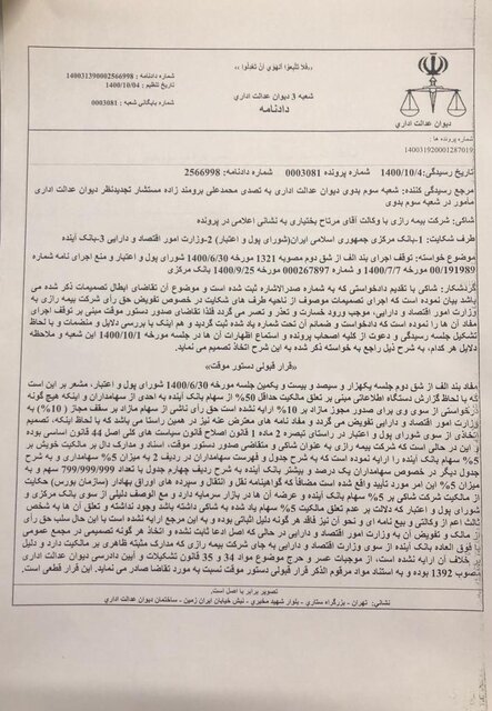 وزارت امور اقتصادی و دارایی همچنین رای دیوان عدالت در این زمینه را نیز منتشر کرد که تصویر آن در ادامه قابل مشاهده است.