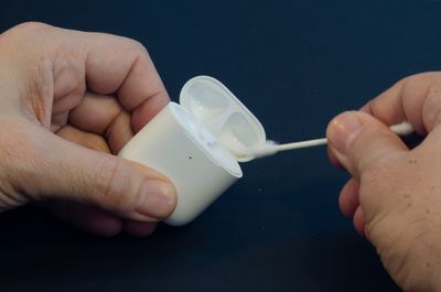 دوباره با استفاده از یک پارچه خشک، جعبه شارژ را به آرامی پاک کنید. اگر واقعا نیاز است، مقدار بسیار کمی الکل به پارچه اضافه کنید و سپس آن را تمیز کنید. همچنین میتوانید از دستمال مرطوب ضد عفونی کننده نیز استفاده کنید. فقط مراقب باشید هیچ مایعی وارد درگاه شارژ نشود.