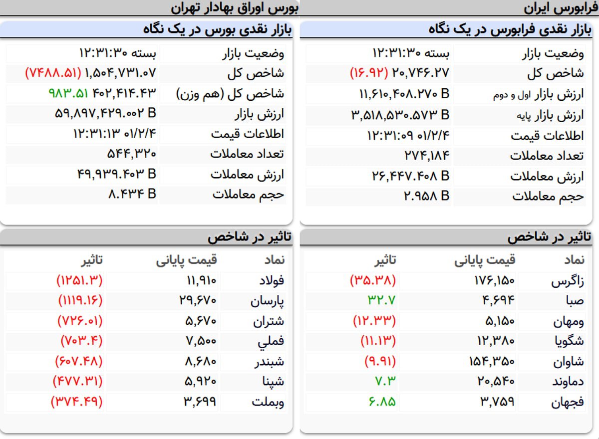شاخص کل بورس اوراق بهادار تهران در پایان معاملات امروز با کاهش 7488 واحد همراه شد.