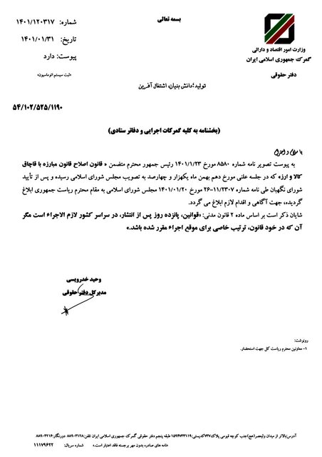 گمرک ایران قانون اصلاح قانون مبارزه با قاچاق کالا و ارز را به گمرکهای اجرایی ابلاغ کرده است.