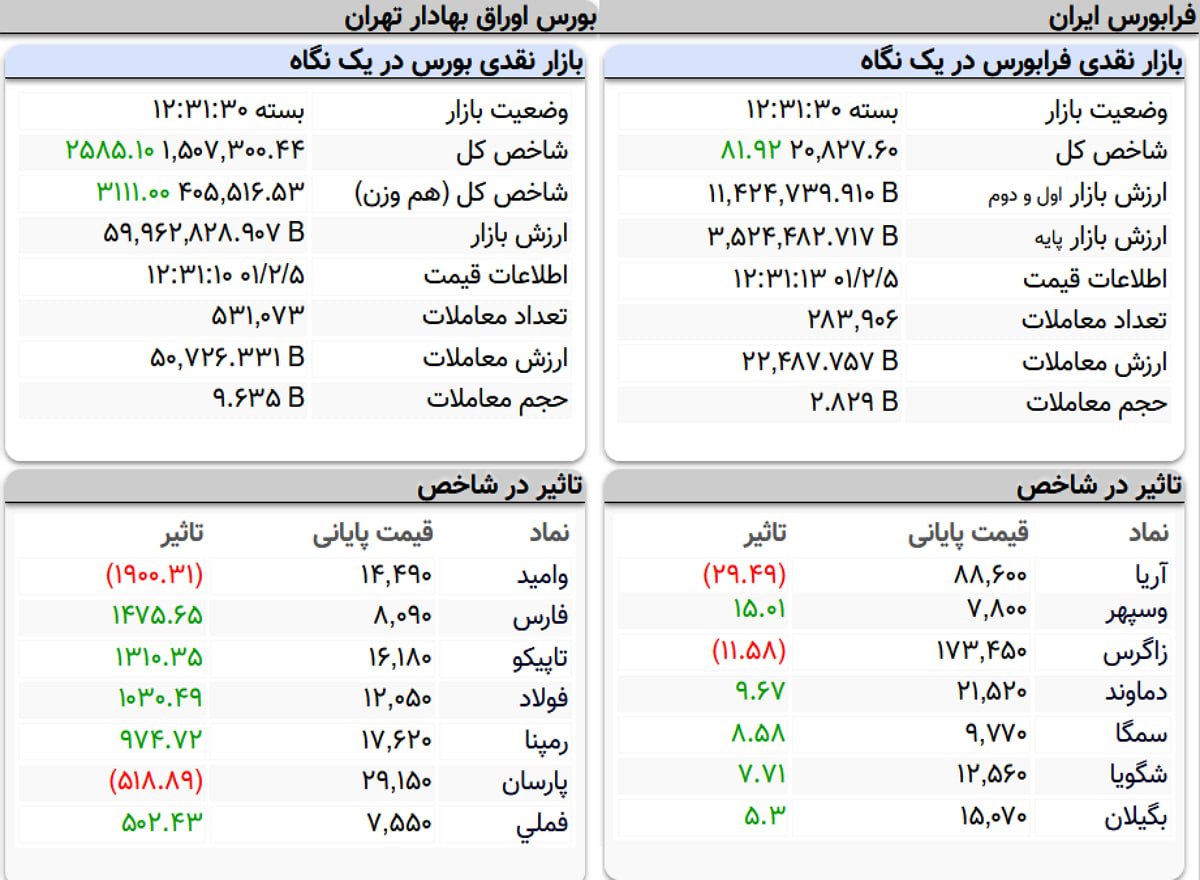 شاخص کل بورس اوراق بهادار تهران در پایان معاملات امروز با افزایش 2586 واحدی همراه شد.
